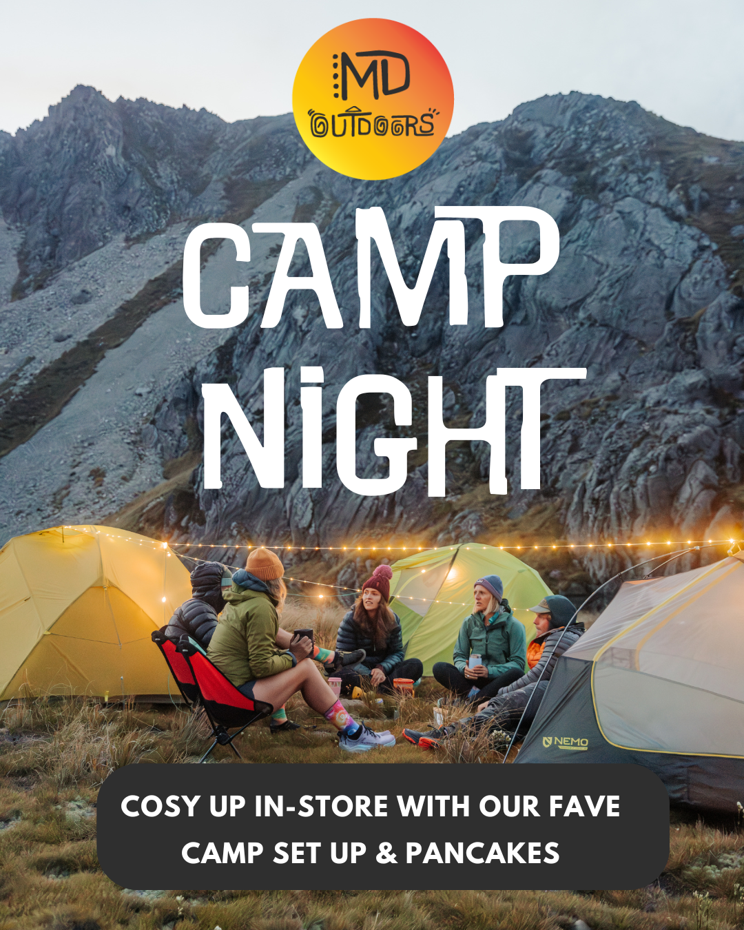 We'll have the shop fully decked out with all our Nemo camping gear: think tents, twinkly lights, sleeping mats, sleeping bags, pillows & more. So you can cosy on up and test out how they feel.